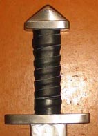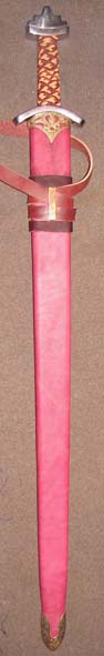 Материалы: клинок - стеклотекстолит СТЭФ-У 10мм; гарда/рукоять - сталь; обмотка - кожаный шнур, кожаная косичка; ножны - дерево/кожа.